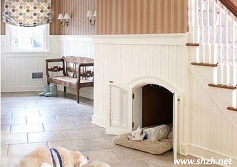 喜歡在家養(yǎng)寵物的人,為了在家給自己的寵物置個窩,想盡了辦法。如果你家有樓梯的話, 那這個問題特別好解決的。取樓梯下半部分,做個方形空間,再開個圓拱門,好了,從起你家寵物就有自己獨立的空間了。