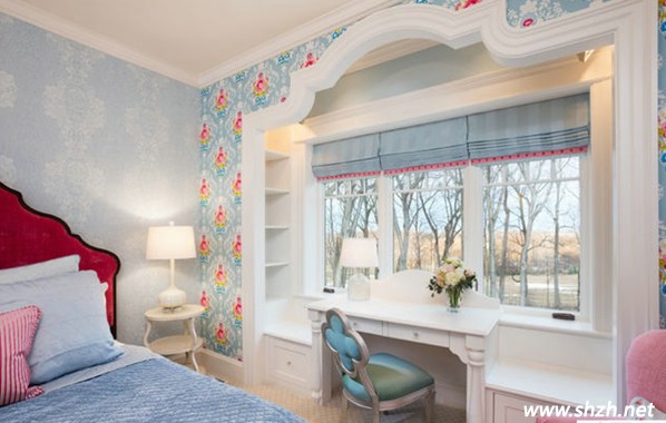 將地中海風格臥室飄窗改造成寫字臺,讓人的第一印象就是浪漫與清新并存。飄窗被改成造型對稱的純白色的寫字臺,兩邊是高度均等小柜子可容納雜物,左邊被改造成許多空間的小隔斷用來擺放書籍,既好看又實用。藍色基礎色上的粉色小碎花的墻壁和灰藍色的卷簾又體現一股甜美的田園風格。