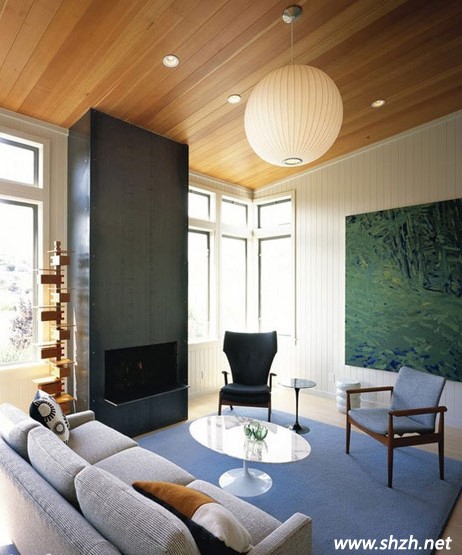 樓層較低的客廳會(huì)讓人覺得壓抑,仿佛一種站不起來(lái)的感覺,在視覺上也會(huì)覺得有擁擠的感覺。厚實(shí)的淡藍(lán)色地毯能在無(wú)形中減弱這種壓迫感,甚至讓人有誰(shuí)在上面的感覺,輕巧的單椅可隨意移動(dòng)增添了更多的自由。