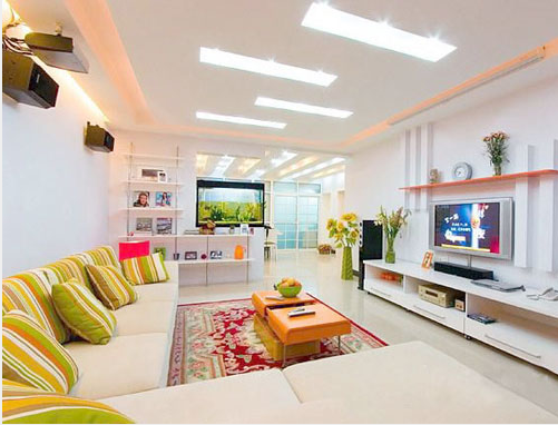 客廳的色彩很明媚,白色的墻面讓整個(gè)空間看上去很干凈,但同時(shí)鮮艷色彩的運(yùn)用點(diǎn)亮了視覺效果。