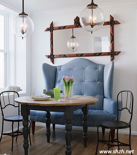 這樣的小餐桌設計的很有藝術感覺,上面的鏡子放大了室內的空間,藍色的沙發(fā)顯得更加溫暖舒適,旁邊鐵制的小餐椅也增加了幾分活潑性。