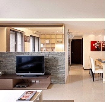 這個角度為客廳的電視背景墻,背景墻下面以青石磚貼面,體現(xiàn)出了屋主所居住的環(huán)境溶于大自然,上面是茶色半透明玻璃,把書房與客廳隔開彼此通透,由此可體現(xiàn)出業(yè)主對于明亮的要求。書房采用玻璃移門也主要是為了餐廳的明亮!