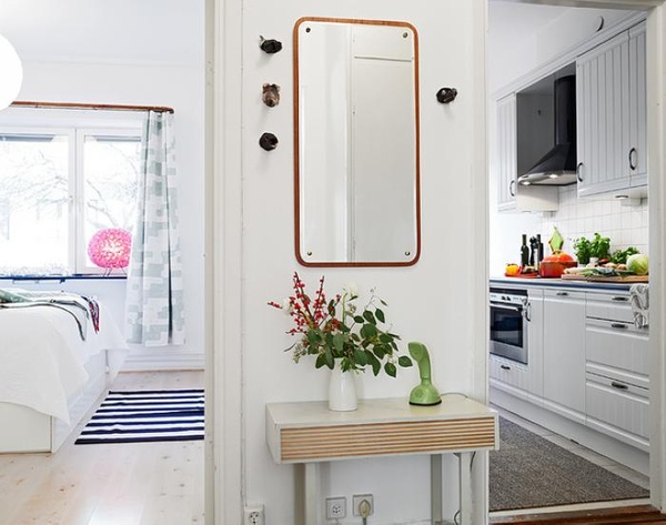 這是一個(gè)過道處,臥室與餐廳相鄰。過道里的茶幾上擺放著綠色植物,鏡子亦可以做為裝飾物掛在墻面上