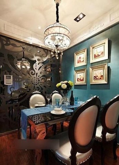 餐廳的吊燈是水晶的,這是不能錯過的,整面墻是帶點藍(lán)色的。