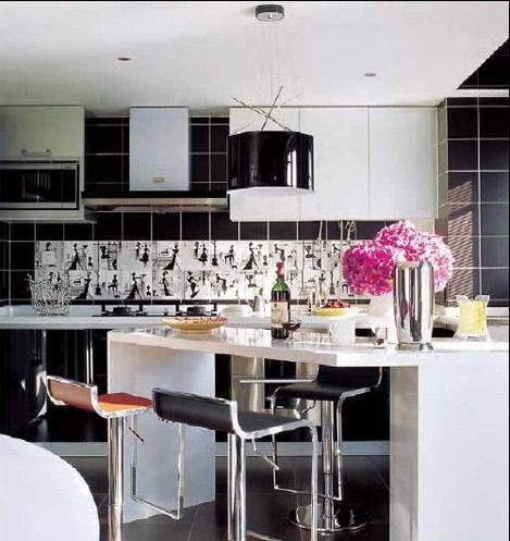廚房間的吧臺(tái),時(shí)髦女郎男女居家中的最愛。黑白插畫瓷磚,改變了黑白基調(diào)的沉默嚴(yán)肅,使房間變得輕松,浪漫。廚房這個(gè)沒有浪漫氣氛的地方也可以生出浪漫的感覺。