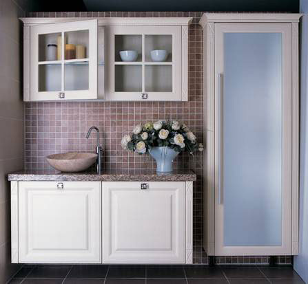 將往昔的魅力與現(xiàn)代生活結(jié)合在一起,永遠(yuǎn)是設(shè)計(jì)師創(chuàng)新的源泉。浴室家具門(mén)板上的刀切紋路,小巧古典的柜門(mén)把手,這些細(xì)節(jié)跟過(guò)去在舊電影中看到的一樣,呈現(xiàn)著一股凝固住時(shí)間的懷舊氣息。只有注重整體細(xì)節(jié),才會(huì)有完美無(wú)暇的整體效果。整面主題墻,無(wú)論色調(diào)、造型與飾物的擺放,都顯得輕松而舒適,每日一小時(shí)的衛(wèi)浴時(shí)光成為鄉(xiāng)野中的小憩,帶著懶洋洋的悠閑氣質(zhì)。