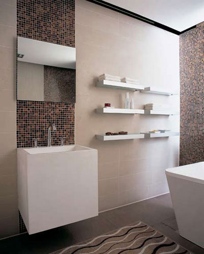 概要: 與客廳一樣,浴室也需要有一面獨(dú)有的“主題墻”。主題墻的魅力在于,它的色彩和廓形能為整體衛(wèi)浴增添醒目的時(shí)尚感。整合了浴室的所有色彩精華:浴室家具、面盆、龍頭、浴室鏡、瓷磚、馬賽克……,創(chuàng)造了衛(wèi)浴中極富個(gè)性的視覺(jué)核心,以及無(wú)限快樂(lè)的主題衛(wèi)浴生活?! ∽厣o人一種沉穩(wěn)、高貴之感,大面積的棕色馬賽克和造型硬朗的浴具搭配,營(yíng)造出平穩(wěn)卻不乏生動(dòng)的空間。
