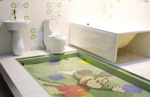 水循環(huán)系統(tǒng):在兒童衛(wèi)浴間設置水循環(huán)處理系統(tǒng),循環(huán)池底面配以可愛的卡通馬賽克圖案,利用面盆及浴缸使用后的污水,循環(huán)處理后進行馬桶沖洗,不僅有效地節(jié)省了水資源,更在日常生活中熏陶了孩子節(jié)約用水的意識以及環(huán)保精神。
