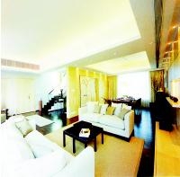 本案為大戶型的客廳,設(shè)計(jì)師將客廳與茶室的隔墻打開(kāi),陽(yáng)臺(tái)、客廳與茶室渾然一體。取消客廳的主視燈而代以頂面筒燈,莎朗娜米色地面、弧形西班牙軟木電視背景墻、弓形落地?zé)艏皢】诘暮椭C與呼應(yīng),渲泄出業(yè)主大度和內(nèi)斂的氣質(zhì)。