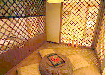 茶室里一個小滕桌,幾個靠背墊,散發(fā)著典雅古樸的中式風情。