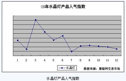 記得《非誠勿擾》的影片最后,范偉哭喪著臉說:“百年不遇的金融危機(jī)讓我趕上了,今年的經(jīng)濟(jì)形勢太不景氣了,五大投行黃了仨,什么都賣不動(dòng)了?!苯鹑谖C(jī)影響最大的就是房產(chǎn)業(yè),房產(chǎn)業(yè)不景氣,導(dǎo)致家裝市場“唇亡齒寒”,這樣的形式下,可以想象燈具市場的形勢有多么嚴(yán)峻。因此,水晶燈的市場比較低迷,到了12月人氣指數(shù)甚至跌落到全年最低谷。