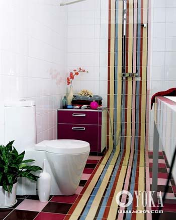 彩色地磚是突出的設(shè)計,粉色、紅色與咖啡色自然過渡,穿插裝飾,整個色彩環(huán)境讓人感受到一種溫暖和舒爽,并搭配同色系的浴室配件,呈現(xiàn)出獨具魅力的女性氣質(zhì)。