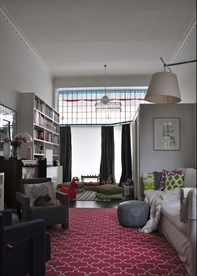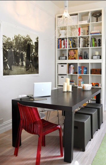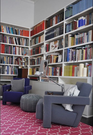 二樓又重現(xiàn)了粉色浪漫,在這個(gè)滿(mǎn)是書(shū)香氣息的書(shū)房里,沿用一樓的粉紅色地毯和單人沙發(fā),保持室內(nèi)設(shè)計(jì)主題的一致性。L型設(shè)計(jì)的書(shū)柜,貼合墻壁,直接到房頂,能更好地利用墻角的位置,又能更好的利用收納空間