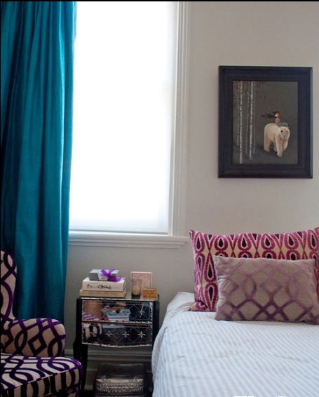臥室是另一個(gè)重點(diǎn),進(jìn)入臥室,臥室里的裝飾沒(méi)有如同客廳的粉色,粉色在某種程度上是浪漫,還是另一個(gè)貶義——幼稚的代名詞。那么臥室的裝飾重點(diǎn)就在紫色、紅色曲線(xiàn)的綜合運(yùn)用了。