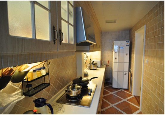 廚房射燈設計的比較人性化,每個使用空間處都安裝了射燈,做到將方便帶到每個操作臺旁。展柜的射燈光線由每格頂處打出,使展柜變得立體而有了重心,并且增強了時尚感。