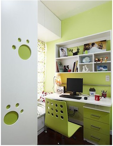 書房是淡淡的綠色包圍著的,墻壁的淡綠色讓人看了就很舒服,白色的書架、壁櫥和淡綠色座椅、柜體很搭配,整個(gè)書房設(shè)計(jì)線條簡潔。而且綠色的墻壁對人的眼睛也很有好處呢。