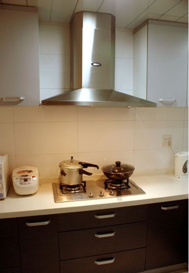 直線型的櫥柜,冰箱放置在窗戶的另一角,一點(diǎn)兒也不影響操作臺(tái)的使用。