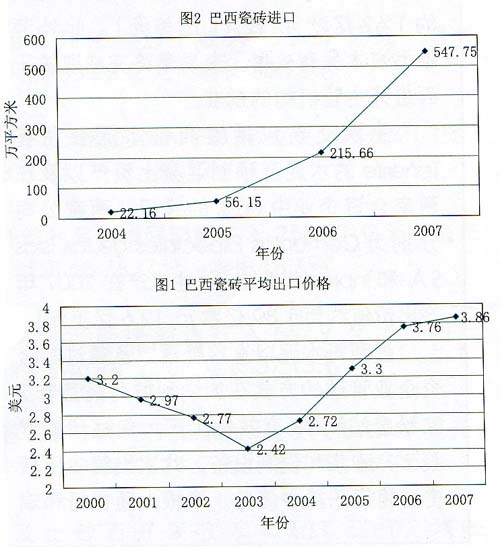 巴西瓷磚出口在2000年至2004年之間呈增長(zhǎng)趨勢(shì),從5670萬(wàn)平方米增長(zhǎng)到了1.26億平方米.之后出現(xiàn)下降趨勢(shì),2007年降到了1.02億平方米。前期得到增長(zhǎng)是因?yàn)椤鞍臀鞲煞ā碑a(chǎn)品的質(zhì)量與濕法產(chǎn)品非常接近,加上合適的利率,于是生產(chǎn)商紛紛尋找機(jī)會(huì)擴(kuò)大市場(chǎng)。然而,隨著利率的變化以及國(guó)內(nèi)市場(chǎng)的增長(zhǎng),生產(chǎn)商們改變了策略,大大減少了出口。2C104年之后,雖然出口量下降.但是出口額反而增加.這主要是由于出口產(chǎn)品中價(jià)格較高的產(chǎn)品所占比重增加.平均出口價(jià)格上漲(見(jiàn)圖1)。
