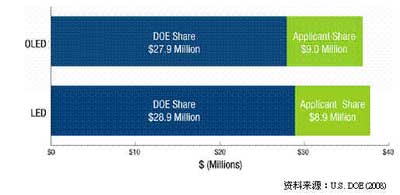 2008年,美國固態(tài)照明共有51個項目計劃,總經(jīng)費(fèi)為7470萬美元(圖一),其中OLED照明共有25個項目,總經(jīng)費(fèi)為3690萬美元,占所有項目的49.4%,其中美國能源部投入2790萬美元,而申請參與此計劃者則投入900萬美元;LED共有26個項目,總經(jīng)費(fèi)為3780萬美元,占所有項目的50.6%,其中美國能源部投入2890萬美元,而申請參與此計劃者則投入890萬美元。從OLED照明與LED的研究經(jīng)費(fèi)分布,我們可以發(fā)現(xiàn)OLED照明項目的比重(49.4%)已經(jīng)等同于LED項目,雖然OLED照明尚未量產(chǎn),但是OLED照明具有后起之秀的態(tài)勢,所以國雖投入LED照明技術(shù)研究的同時,也加重OLED照明的研發(fā),可見美國是越來越重視OLED照明。