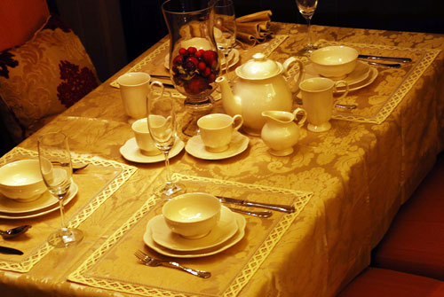 餐桌上,餐布選用暗金色帶緹花的設(shè)計展現(xiàn)低調(diào)的奢華感,配合素雅的奶白色餐具別有一番特色,再擺上一個玻璃的器具做點綴,內(nèi)置紅色的裝飾品也跟其粉紅色的椅子相呼應(yīng),更顯優(yōu)雅溫馨的感覺。