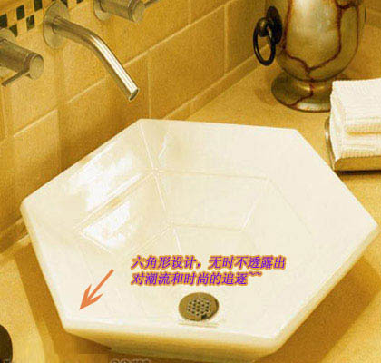 與眾不同的六角形設(shè)計(jì),潮流中透著古典,樸素中透露著高雅??鋸埓竽懙脑O(shè)計(jì)無時(shí)無刻不流露出張揚(yáng)的個(gè)性。當(dāng)之無愧的成為現(xiàn)代浴室擺設(shè)的焦點(diǎn)所在,此時(shí)的她不再單單是一件衛(wèi)浴 面盆,而是一件巧奪天工的藝術(shù)品~~