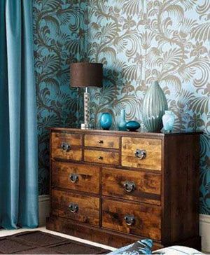 淺藍底灰紋palmyra墻紙,淡藍色拉文納天鵝絨窗簾牢牢吸引視線。棕色地毯,Garrat木制舊抽屜立于墻邊,卻依然很搶眼。地毯上黑底、白底藍花的兩個小靠墊觸手可及。John Lewis灰罩臺燈,藍灰色Leonardo花瓶與墻紙幾乎融為一體。深藍色、淺藍色小裝飾花瓶十分精致。
