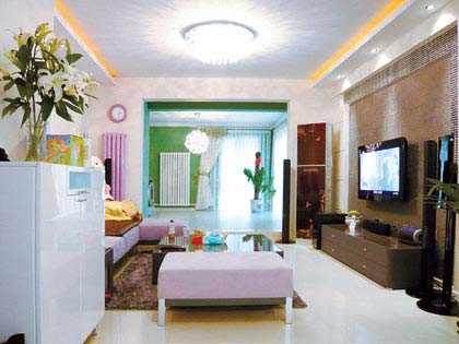 女主人非常喜歡紫色,沙發(fā)、電器等選購(gòu)的都是紫紅色。因此設(shè)計(jì)師用淡紫色壁紙鋪帖電視背景墻,使硬裝修部分和家具搭配很協(xié)調(diào),營(yíng)造出浪漫嫵媚的效果。同時(shí)馬賽克做電視背景墻也是一大創(chuàng)新,馬賽克流暢的線條感和時(shí)尚的大花壁紙個(gè)性化地搭配在一起,巧妙地呈現(xiàn)出優(yōu)雅時(shí)尚的墻面層次。