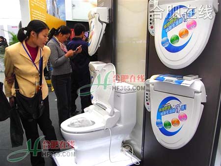 在會展中心一展區(qū)內,眾多造型別致的馬桶吸引了眾多市民的目光。記者走近一看,發(fā)現這里主要是展示智能便座。記者發(fā)現,這種便座比普通便座多出一個長條形的“功能區(qū)”,上面有許多功能按鈕,有何需要,只需按下相關按鈕即可,其中一些高檔的便座更是配置了遙控器,坐在馬桶上就可選擇自己需要的服務。