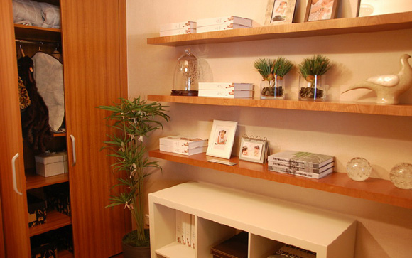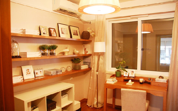 對(duì)于上班族來(lái)說(shuō),書(shū)房肯定是必不可少的。雖然空間挺小的,但并不影響它的功能發(fā)揮。這種墻上橫板的裝飾架很大程度上可以放大空間做到收納用。有一個(gè)缺點(diǎn)就是重物不太能承接,日常擺設(shè)完全能做到。