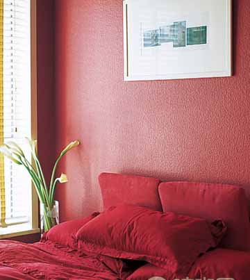 正西方位臥室的紅色墻面和同色系的床品選擇,能化解居室的沉悶感