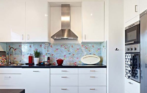 富有田園風(fēng)的花朵壁紙襯托白色櫥柜,與整個(gè)空間裝飾相互呼應(yīng),藍(lán)與白的對(duì)比色調(diào)搭配,讓人有種親切的舒適感。而背景墻上零星點(diǎn)綴的花朵,成功營(yíng)造了視覺(jué)亮點(diǎn)。料理臺(tái)上一些小裝飾,則為色調(diào)簡(jiǎn)單的廚房注入了鮮活。