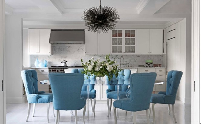 餐廳是與廚房相連的,白色的有機(jī)玻璃餐桌再配上白色漆腿的簇絨餐椅。 地面鋪的是淺色的實(shí)木復(fù)合地板,讓人一走進(jìn)廚房總感覺(jué)空間變亮之感覺(jué)。
