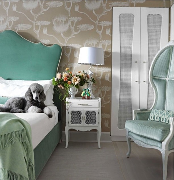 臥室的墻面滿(mǎn)貼藝術(shù)墻紙,房間最起眼的是絲絨的床,薄荷綠毛毯,淺色地板,法式的篷椅。這些都顯得主人家的高貴及很有品位。