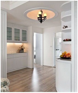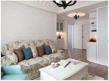 頂角的花紋白色石膏線(xiàn)和歐式小白桌,搭配上帶鄉(xiāng)村氣息的碎花沙發(fā),一種恬淡陶然的田園情懷再現(xiàn)精致浪漫的都市品質(zhì)。