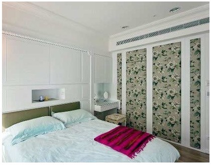 床頭嵌入式背景墻柜設(shè)計(jì),合理利用空間的同時(shí)更是很好的收納空間,可容納很多雜物。一側(cè)的歐式小凳延續(xù)了客廳的歐式田園風(fēng)格。