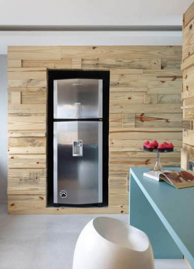 公寓內(nèi)的裝修采用聚合水泥,墻壁則選用松樹木拼接而成,原汁原味的設(shè)計自然又環(huán)保。而桌與椅的色彩延續(xù)了客廳的色調(diào),湖藍(lán)點綴白色,清新淡雅!