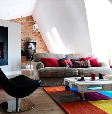 客廳布置設計的豐盈而立體,糖果色的靠枕,彩色拼接地毯,出眾的色彩搭配立刻讓灰色的沙發(fā)外觀變得豐滿起來,使得客廳盡顯歡快本色。