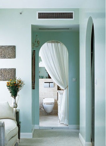 灰湖綠的主臥,自然舒緩,讓人輕盈地沉淪與迷醉。拱門(mén)的弧線柔和了臥室的平直線條,潔白的細(xì)亞麻門(mén)簾的使用也為私密空間添加了浪漫唯美的情調(diào)。