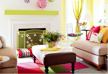 客廳淡綠與玫紅色彩元素的加入,如同將初春里的小花小草挪到了家中。局部色彩的點(diǎn)綴營(yíng)造出春季的清新爛漫。壁爐區(qū)域是房間的焦點(diǎn)位置,將它刷成了白色,作為淡綠與玫紅的背景墻。清新的綠色/溫暖的黃色/甜美的玫紅,都為房間注入了春天的氣息,清幽淡雅。