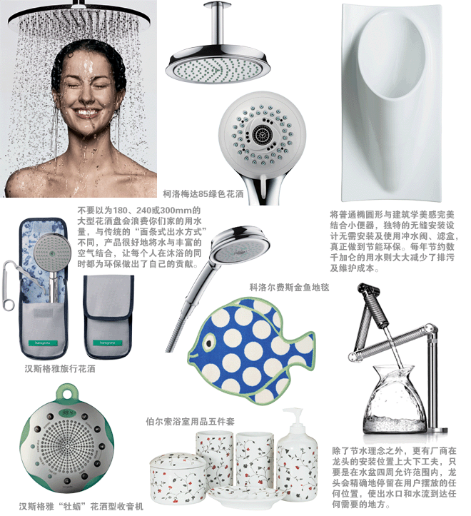 多年來,家居設(shè)計(jì)師們?cè)诃h(huán)保和人性化的細(xì)節(jié)設(shè)計(jì)上一直不遺余力。每一個(gè)用心的節(jié)能概念都體現(xiàn)了人們對(duì)綠色生活的向往和追求。正是這些看來細(xì)小的想法和簡(jiǎn)單的產(chǎn)品,構(gòu)成了我們追求環(huán)保的夢(mèng)想世界。即使是那幾樣衛(wèi)生潔具和衛(wèi)浴工具也可以成為有著無限創(chuàng)造力的元素:把浴缸搬到前,泡泡浴的時(shí)候可以享受窗外的美景,在高樓中如同在空中洗浴,在別墅中則有著沐浴在大自然中的釋放感;或者選擇一個(gè)超大的花灑噴頭,甚至可以有1平方米大,水流宣泄出來,像暴雨一樣痛快。