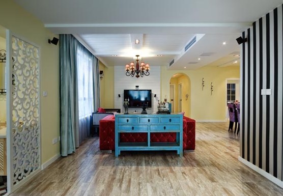 明黃色的墻面,首先在大面上先給空間上了色,居室更顯寬敞明亮。還有一種**裸的中式情結(jié),亞光的實(shí)木家具,是規(guī)規(guī)矩矩的棱角分明的造型,流淌著木的厚重感,并采取做舊的效果,以銅鎖點(diǎn)綴,突出了歷史的遠(yuǎn)久性。