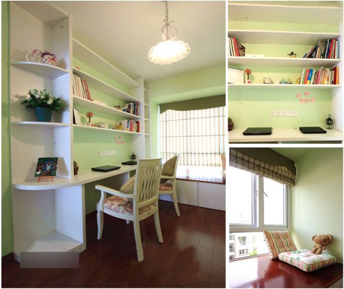 考慮的對(duì)眼睛的好處,書房背景墻面選用了大量的淺綠色,搭配上深色的實(shí)木地板,給人一種厚重感。在這樣光線自然的書房里學(xué)習(xí),愜意舒適。