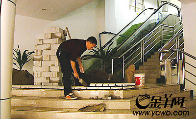 昨天上午10時(shí),中意花苑首層商鋪38位業(yè)主齊刷刷出現(xiàn)在小區(qū)中意街,他們?cè)跇翘蓍g拉起了寫著“維權(quán)有理,侵權(quán)有罪”的橫幅。雇來的建筑工開始在樓梯口砌磚墻。建筑工說,業(yè)主讓他把磚墻砌到一米高以上。記者在現(xiàn)場(chǎng)看到,磚墻把樓梯口圍了起來,但留一個(gè)出口給行人出入。