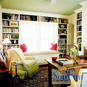 原本普通的一扇窗戶,四周做成書架,窗臺下擺張長條的柜子做成飄窗露臺。倚坐在飄窗上,隨手就能拿到書籍,休閑閱讀好不愜意!