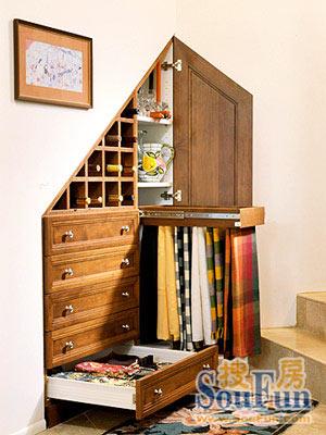 為樓梯下方的空間量身制作一個柜子,多種功能的格子和抽屜都有,可以裝下衣服、配飾,甚至能裝酒。