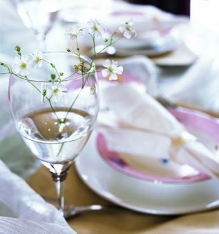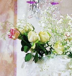 西式婚慶,餐廳可以較多地擺放些鮮花,畢竟鮮艷的色彩與鮮花的喜人,可以大大提升人們用餐時的喜悅感。除了在餐桌中間擺放一個較大的花瓶,并插滿各色鮮花做主體之外,還有很多細(xì)節(jié)可以用鮮花點綴。在西式餐桌擺放禮儀中,習(xí)慣預(yù)先將餐具整齊地擺放在餐桌上。因此,可以在菜單上插上小花、用花朵制做餐巾環(huán)、用綠葉制做 餐巾墊等。另外,餐桌椅同樣是鮮花施展美麗的地方,將一些細(xì)軟的小花裝扮其上,或者用一些花卉纏繞于椅子上,能制造出更多優(yōu)美、浪漫的婚慶感。