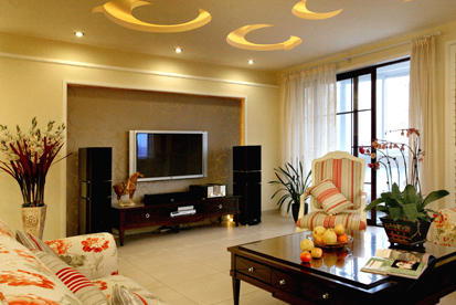 這個空間里運用最多的就是淡金色了,是燈光的映稱下顯得溫馨亦常。田園花朵在布藝沙發(fā)上,這個空間里依然大氣,依然溫馨,這是家的感覺。