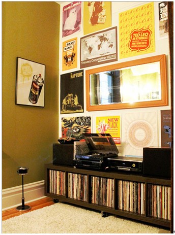 書房一角放滿了CD,閑暇時刻可以聽聽音樂或自己高歌一曲。收納方面CD全部放置在單層收納柜中。柜上放置著播放器和音響,書房一角的音樂小天地。墻壁上大大小小不一致的裝飾畫,讓這面墻壁從色彩到線條上都碰撞出一種**,為了很好的平衡這種視覺刺激,為了突出這面墻所來帶的刺激,在另一面墻的設計上只采用了墨綠的素色。