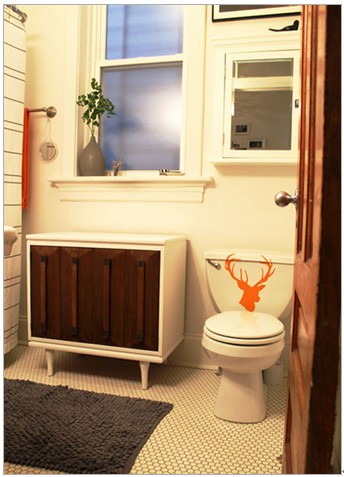 柔和的燈光可避免衛(wèi)浴間的冷清感,橘紅色的鹿頭裝飾在泛白的空間內增添些鮮活。衛(wèi)浴間求整潔/明亮的同時,收納也是很重要的一點,這里沒有過多的裝飾,一面鏡子/兩用的收納柜,鏡子背后是收納柜哦,很實用又不占空間。