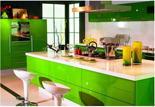 清新的明黃、嫩嫩的綠意、都無盡的透露著春意的到來,給生命已無數(shù)的期許。就讓充滿生命力的鮮活綠色走進(jìn)人們的廚房,豐富視覺的想象力。不同程度的綠色空間主題,可讓廚房空間氛圍鮮活跳躍。空間色彩搭配上可選用暗藍(lán)色的涂料,在配合草綠色的櫥柜及同色系的餐具,可使整個(gè)空間輕松氛圍與穩(wěn)重氣息很好地結(jié)合起來,營造出一種輕松、明快的廚房環(huán)境。